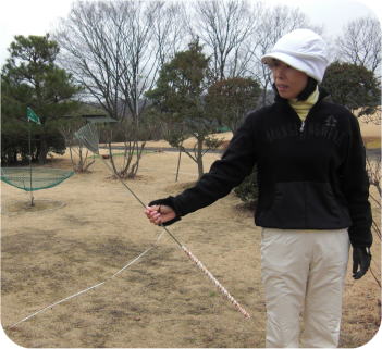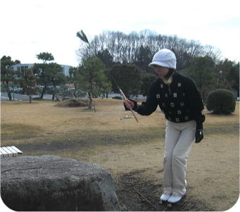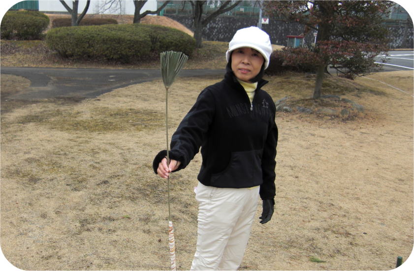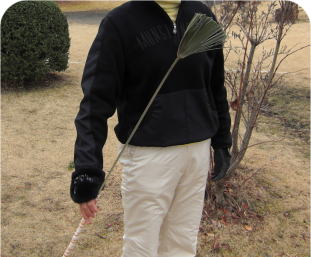 | シュロの茎がしなるようにしっかり振り下ろします。 | しっかり打つためには、打つ瞬間に手を止めてくださいね。 |