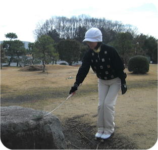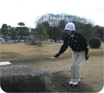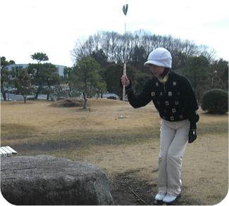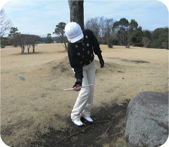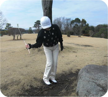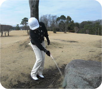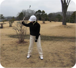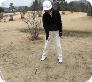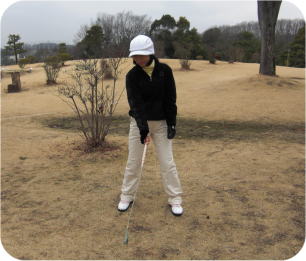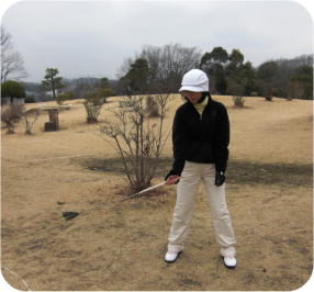 | 実際はしっかり腰を落として叩く体勢でやってくださいね。 | ここで手は止めます。自然とヘッドだけ左足の方に走って 行きます。これをくり返して練習してインパクトのヘッドの 走りをより早く、より早くと研究してくださいね。 |